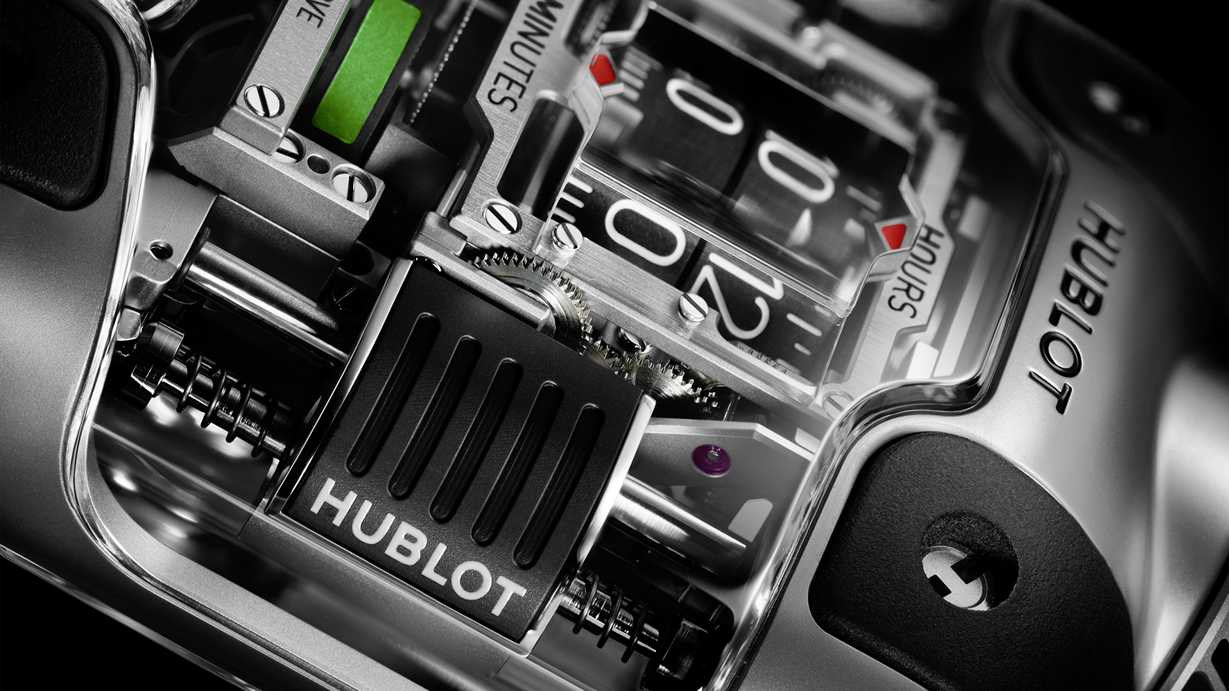 Diese beiden vertikalen Gewichte greifen in eine Zahnstange ein und ziehen das Uhrwerk bidirektional auf – eine exklusive, ebenfalls zum Patent angemeldete Entwicklung von Hublot, die der MP-10 eine Gangreserve von mehr als 48 Stunden verleiht. Über die Krone bei 12 Uhr kann die Uhr von Hand aufgezogen werden, während die Uhrzeit über eine zweite Krone eingestellt wird, die am Gehäuseboden angebracht wurde, um die fließenden Linien zu wahren.